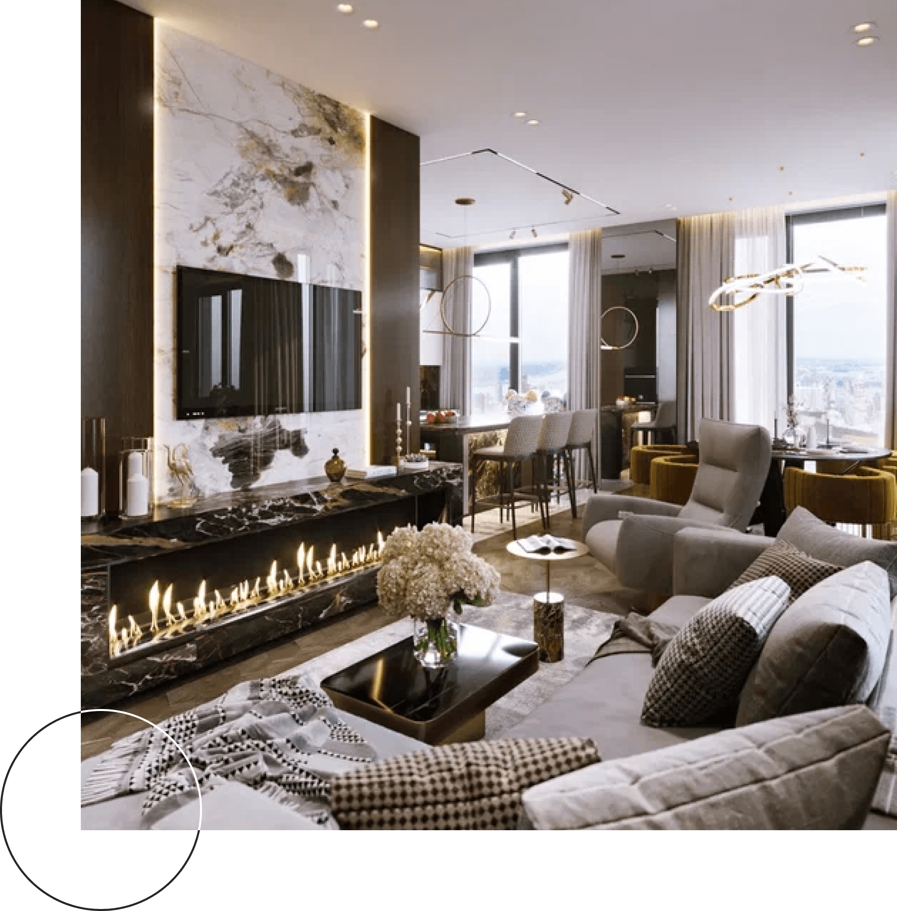 Кровать в спальне размера кинг сайз, с высоким матрасом. И изголовье кровати украшено мягкими панелями с изысканными, стеклянными вставками. Два роскошных светильника, свисающих по бокам, придают акцент в декоре этому уютному уголку. Рядом, с обеих сторон кровати расположили 2 прикроватные тумбочки.