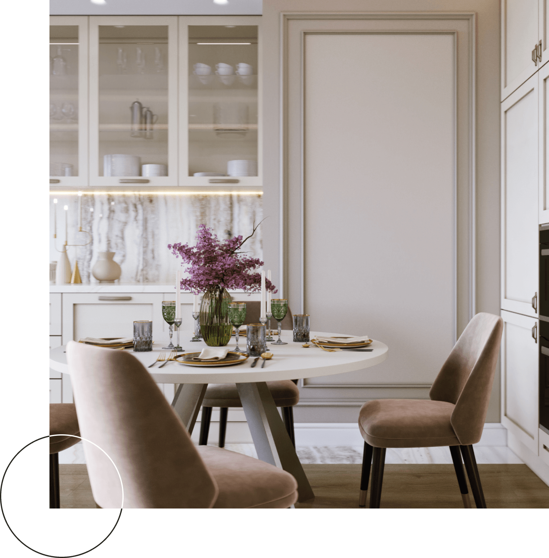 Латунные детали и глянцевые поверхности стола и кухонного гарнитура служат великолепным дополнением к стилю. Они придают интерьеру блеск и утонченность, создают эффектную игру света и отражений.