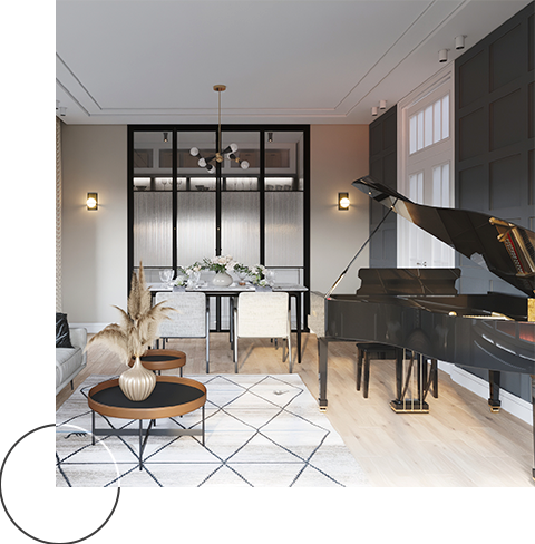 На полу плитка в виде стилизованной «тераццо».